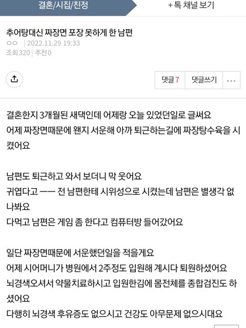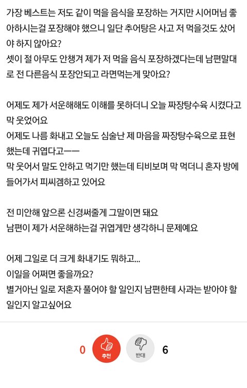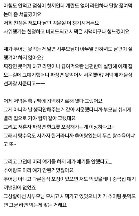 아니 댓글들 반응 이상하네ㅋㅋㅋ 괜찮다고 나는 라면 끓여먹겠다고 하는건 시부모나 남편이 쓰니한테 추어탕 못먹으니 다른거 뭐 좀 사갈까?? 라고 했을때 쓰니 입에서 나와야 하는거 아님?? 추어탕 못먹는거 알면서 라면 먹는 사람 앞에서 이 좋은 걸 왜 안먹나 모르겠네 이렇게 말하는게 정상임?ㅋㅋㅋㅋ