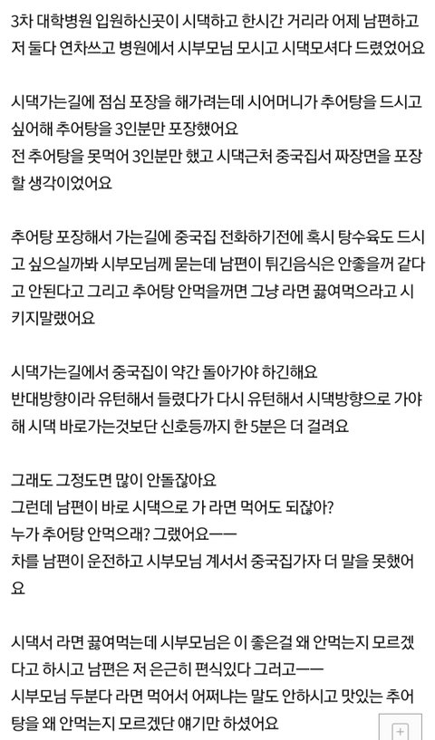 난 잘 모르겠다. 나도 추어탕 못먹음. 근데 2주 입원하신 시부모님 댁에 모셔다드리는데 굳이 차 유턴 해가면서 나 먹겠다고 짜장면 포장해가고싶지는 않을듯. 집에서 라면 끓여먹거나 한끼 거르거나 정 먹고프면 배달을 시키지. 반대로 우리 부모님이랑 남편이라고 생각해도 평소에 라면 잘만 먹으면서, 우리 부모님 퇴원하시는 길에 굳이 짜장면을..? 할것같음. 늙고 아파서 퇴원하는 부모가 조금은 더 우선시돼도 될 상황같은데ㅋㅋㅋ