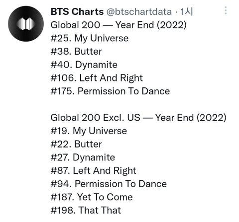 글로벌 200 연간 탑 50안에 케이팝은 방탄밖에 없고,