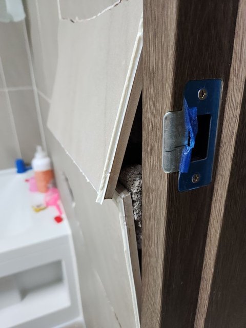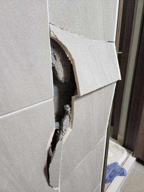 욕실 수납장 뒷쪽 타일이 깨져서 1차 하자접수해서 타일 갈았고