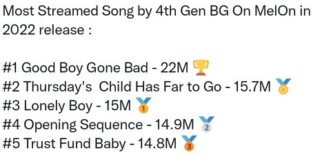 4세대 보이그룹 멜론 1위에서 5위 다 투바투 나머진 다 수록곡인디...아무리 내려쳐도 독보적인걸 우째...그리고 계속 성장세인데 ㅠㅠㅠ 우리 더 노력해서 이번 컴백때 음원 진짜 힘내자