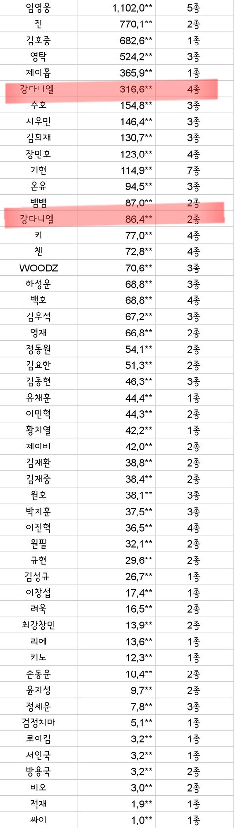올해 발매된 남솔로 판매량인데 강다니엘 정규랑 정규 리팩 합치면 40만장넘어 팬들은 다들 만족중인데 ㅋㅋㅋㅋ