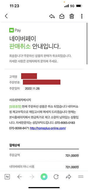 1. 네이버 페이로 결제 후 취소2. 홈플러스라는 브랜드의 홈페이지 링크3. 특가 세일