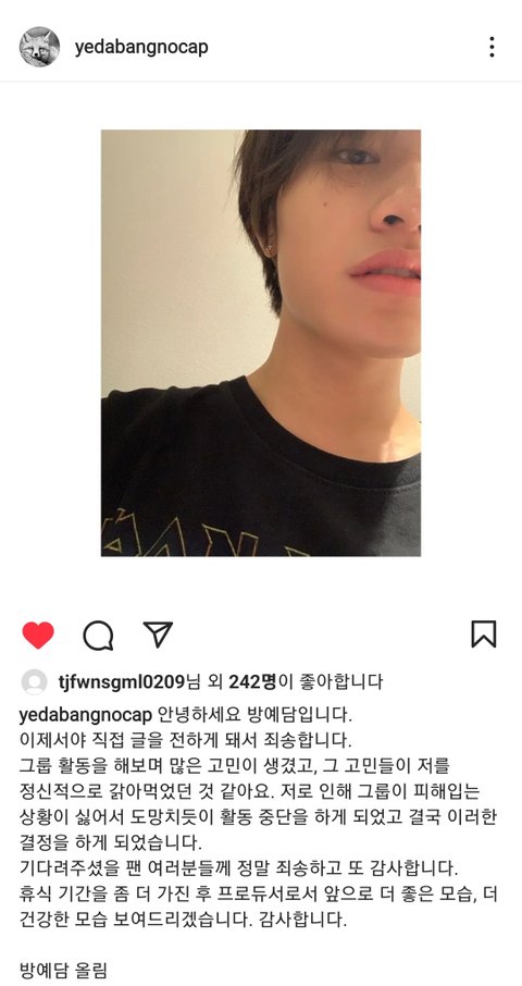 너의 행복이 우선이야 너가 그룹 활동을 하면서 함부로 말하지 못했던 고민들 이제서라도 말해주어서 고마워 그리고 미안해 너의 마음을 이제야 알아주어서 너의 입장을 이제야 알아주어서 미안해 사랑하는 예담아 난 너가 제발 행복해졌으면 좋겠어 너무 미안해 난 그것도 모르고 너를 그리워하고 있었구나 예담아 너무 힘들었지?활동중지도 탈퇴 결정도