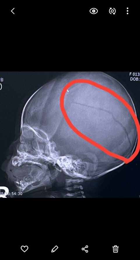 우선 제일 피하고 싶었지만, 안타깝게도 저희 아기 수술을 하였습니다..사고 직후 이미 출혈된 피의 양이 많았고, 성인이였으면 이미 동공확장이나 하체가 마비되는 등의 증상이 나타났을거라고 의사쌤께서 말씀하시더라구요. 그나마 아기가 태어날때 대천문 소천문 같이 뼈들이 열려있어서 출혈로 인한 뇌의 압력을 버텼지만, 병원 입원하고 다음날 찍은 씨티사진을 보니 뇌압이 더 높아져서 대천문쪽 뼈가 더 벌어진 상태더라구요. 아기가 너무 어려서 수술이 조심스럽지만 하지 않을경우 더 안좋아질 가능성이 있어서 교수님들과 협의 끝에 결국 수술을 진행하기로 했습니다.