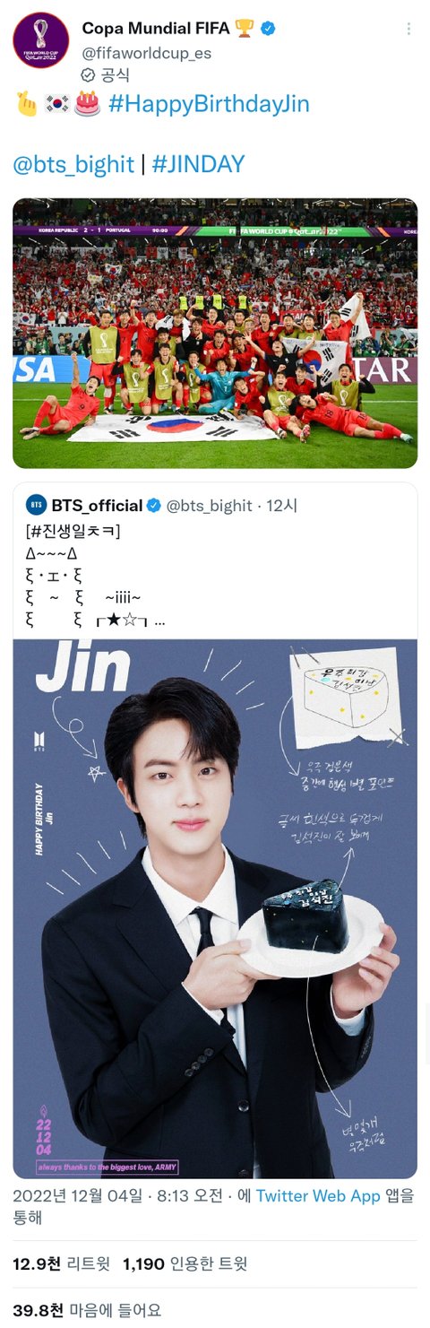 피파에 진짜 아미 있는듯ㅋㅋㅋㅋㅋ 피파 공식 인스타그램에서 한국(포르투갈) 승리 축하 영상으로 국대 경기 장면이랑 전정국 퍼포 영상하고 교차해서 올린 거 봤어? 나 진짜 순간 엥 이게 피파야 한국 방송국이야 했음 ㅋㅋㅋㅋㅋㅋ 붉은악마들 모습부터 아주 한장면 한장면이 죄다 국뽕수치 사망레벨인데 이게 우리쪽 제작 영상이 아니라니ㅋㅋㅋㅋㅋ 피파에서 언제부터 우리가 이렇게 존재감 있었냐곸ㅋㅋㅋ