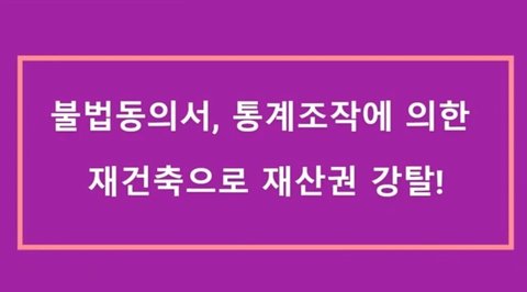 어째서 법치국가인 우리나라에서 이런 말도 안 되는 불법 동의서, 통계 조작에 의한 재건축 추진으로 인해 힘 없는 국민은 왜 재산권을 강탈 당해야만 하는지 모르겠습니다.