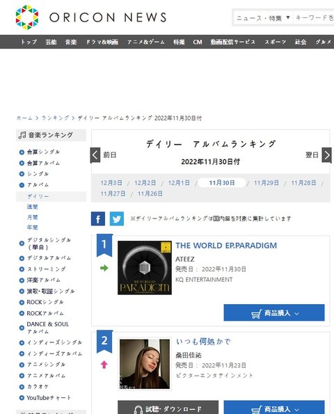 221130 오리콘차트 데일리 앨범 랭킹 1위 에이티즈 PARADIGM