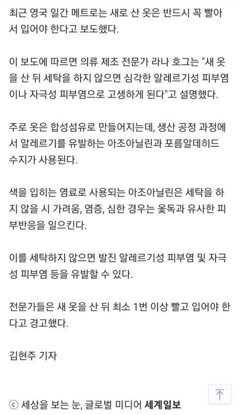 의류벤더출신입니다. 옷 무조건 빨아 입으세요. 옷만들어지는 모든공정은 수많은 사람손으로 이뤄집니다. 자르고 봉제하고 단추달고 깃달고.. 그 사람들 손이 깨끗할수가 없어요.. 공장가면 원단 바닥에서 뒹굽니다. 옷이 완성된 다음 컨테이너 실려 배타면 한달이상 걸려요. 웬만하면 다 빨아서 입으세요.