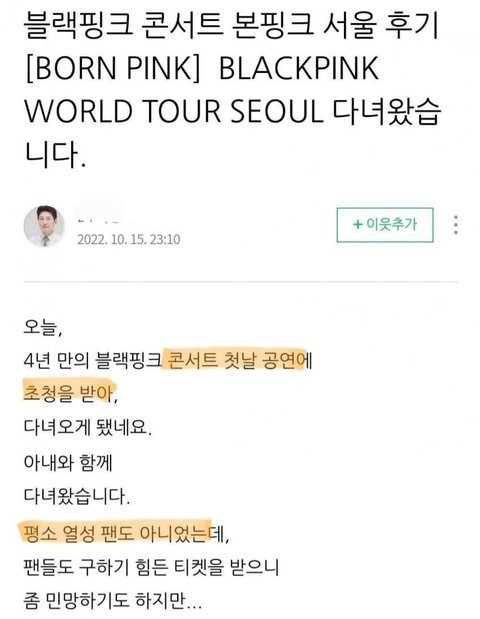 초대권받아서 “내가 기꺼이 가줄게” 이 마인드로 와가지고 호응도 안하고 폰으로영상만 찍고 오죽하면 제니가 폰이랑 공연하는 기분이라고 그만 찍고 즐기자고 했겠냐