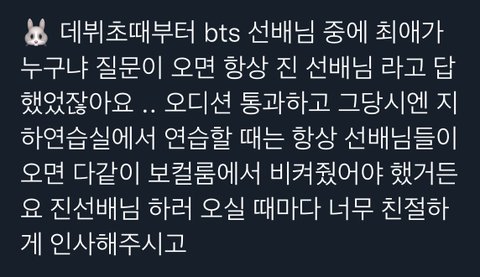 암만 데뷔조라고 해도 데뷔 전까지는 어떻게 될 지 모르는 건데 연생한테 저렇게 먼저 다가간 것만 봐도 인성이 보인다.. 투바투도 다 순딩순딩하고 서로 배려 잘하는데 방탄횽아들도 착하네 힛맨뱅이 참 사람은 잘 뽑아