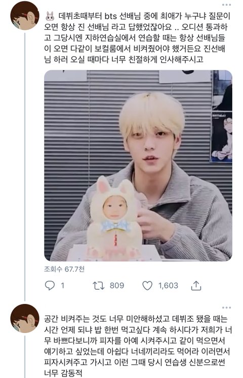 갬동ㅠㅡㅠ 후배들 따숩게 챙겨준 석찌나 받은 거 다 기억하고 고마움 표현하는 ㅅㅂ님이나 둘 다 넘 따숩ㅠ힝그래서 이 둘 랩콜라보는 언제 나온다고..?ㅜ