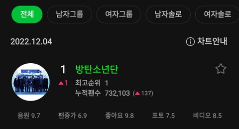 그렇다기엔 하루마다 들어가면 방탄보다 옆에 증가 숫자 높은 남돌이 없는데ㅋㅋㅋㅋ?지금도 1위고