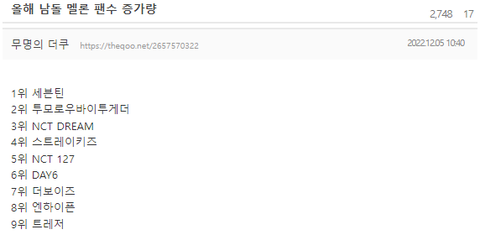방탄 732,103명 / 세븐틴 258,698명 / 엔드림 195,623명 / 일이칠 174,141명 / 데이식스 126,846명 / 투바투 107,564명 / 더보이즈 65,522명 / 스키즈 53,235명 / 트레저 26,000명 / 엔하이픈 24,630명 이렇군