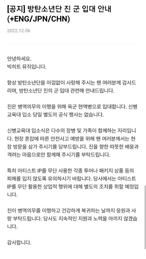 심장 내려앉았다 진짜..... 이미 기사로 날짜같은게 유출됐지만 공지대로 이삐들 절대 가지말자 요즘 너무 추운데 걱정된다.....석진이 몸건강하게 무탈히 잘 보내고 와....