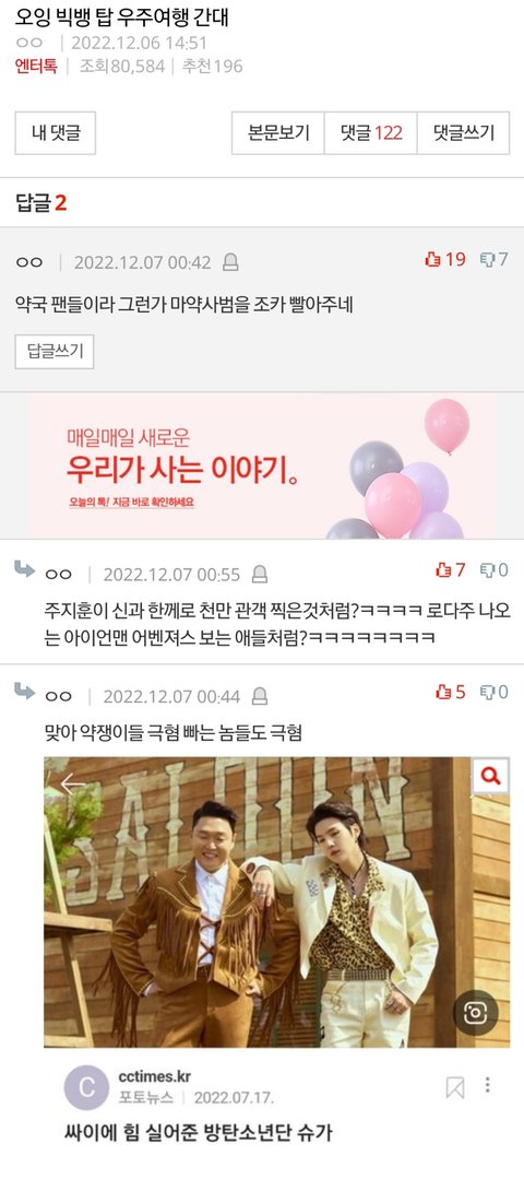 1.탑 영업글 써서 댓글로 탑이 까이니까 마약한 싸이랑 협업했다고 슈가 까는 빅뱅 팬