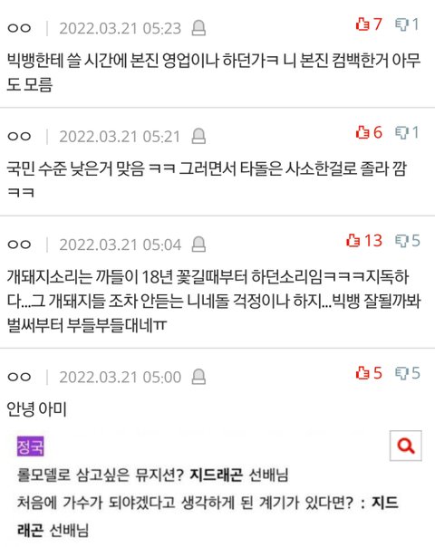 4.빅뱅 까일 때마다 망돌팬 짓이다, 부러워서 억까한다, 이 사람들은 왜 욕 안 하는데? 시전