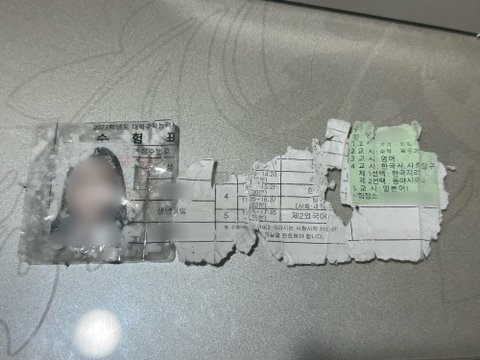 내일 당장 뮤지컬 수험생할인으로 보러가는데 아무리 찾아봐도 안보이는거임 (당장내일이라 취소하고 친구이름으로 예매하러면 수수료4만원듦) 근데 찾아보니까 건조기까지 들어갔다온 바지 주머니에서 발견됨 뭐 어찌저찌 붙여봤는데 이름만 보이고 나머지 다 잘림 하… 수험번호까지 있어야 할인 받을 수 있음? 저렇게 보여주면 못받음?ㅠ 영화관 갔었을땐 대충 보여줘도 걍 할인해주던데 ㅈㅂ 살려주셈;;;