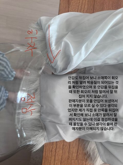 11/5(토) 상품 수령 후 집에서 개봉하여 착용해보았으며, 왼쪽 소매 팔이 빠지지 않는 하자를 발견하였고 안감을 뒤집어보니 회오리처럼 말려 박음질이 되어있는 것을 확인하였음.