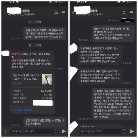 그리고 판매자의 답변대로 손을 억지로 빼다가는 옷의 텐션감이 느껴져서 안감이 찢어질 것 같았고 화가 났지만, 판매자와 감정싸움 하기 싫어 협의가 안 되니 네이버스토어측으로 접수하겠으며, 네이버스토어측에서도 결함이 아니라 판단하면 택배비를 물고 반품하겠다 답변함