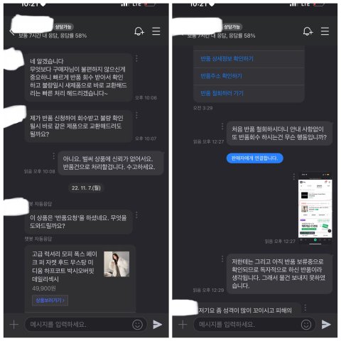 업체 휴무로 답변을 못 하는것으로 생각하였으나, 반품을 접수하자마자 바로 반품 거절되어 톡톡으로 상품 하자인데 반품이 안 되는 이유와 상품 하자 사진을 첨부하면서 필요시 동영상까지 보내겠다고 하자 부분에 대해 재차 강조하였고, 협의 안 될시 네이버스토어로 접수하겠다고 함