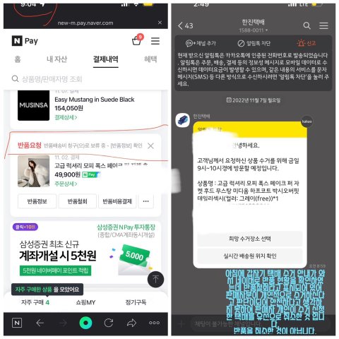 다음날인 11/7(월) 아침에 한진택배에서 반품회수 연락이 왔으며, 반품이 거절되었는데 무슨 상황인가 싶어 네이버스토어를 확인해보니 동일하게 반품 보류가 되어있었음