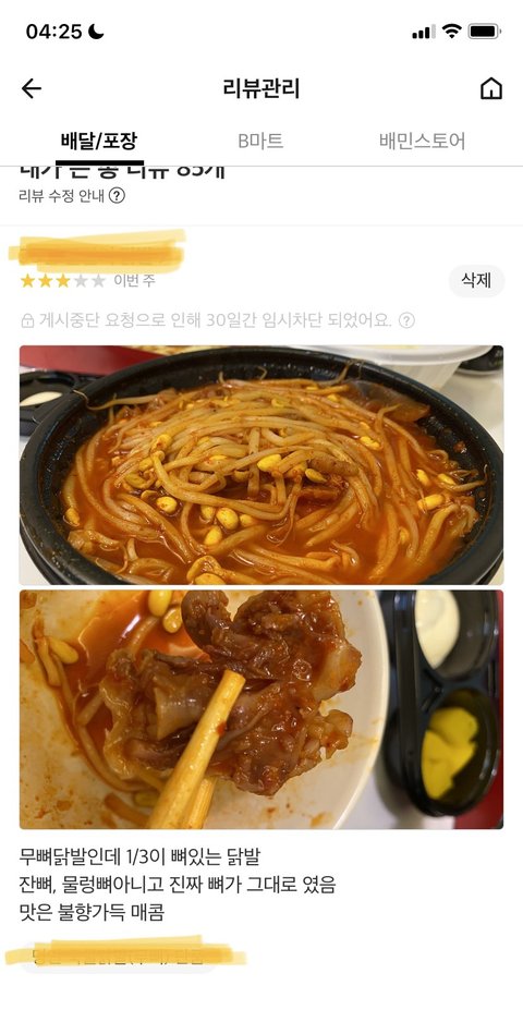 몇번을 다시 읽어도 대충 쓴 느낌은 있지만 객관적으로 사실만 썼다고 생각드는데 저의 리뷰가 타인의 사생활 침해나 가게의 명예 훼손으로 느껴지시나요..? 진짜로 마지막 1/3 정도의 뼈 닭발이 나왔는데 처음 나왔을 때만 찍고 뼈가 자꾸나와서 사진도 안찍고 식사를 종료했구요