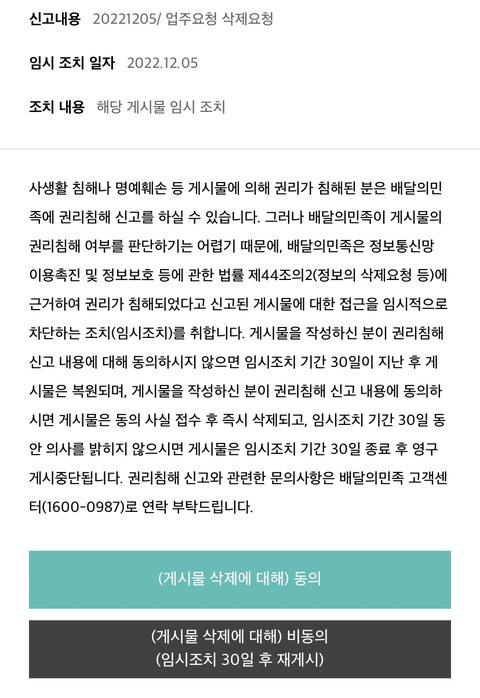 귀찮아서 지나칠까 하다가 은근히 기분나빠서 고객센터에 전화해보니 악성리뷰때문에 만들어진 정책?이라고 사장님에게 리뷰 삭제요청을 받으면 배민에서 임의로 판단 할 수 없기때문에 거의 무조건 해준다며 사장님들의 권리라는 식의 답변을 하더라고요
