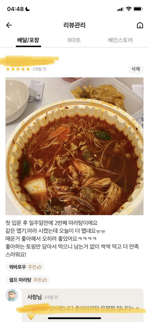 사진처럼 평소 리뷰는 객관적으로 쓰는 편이고 맛있는건 맛있다 가끔 만족스럽지 못한 부분이 있으면 피드백주는 편이에요 부모님이 장사를 하셔서 자영업의 어려움을 잘 알기때문에 절대 무리한요구나 필요이상의 컴플레인을 걸지 않아요