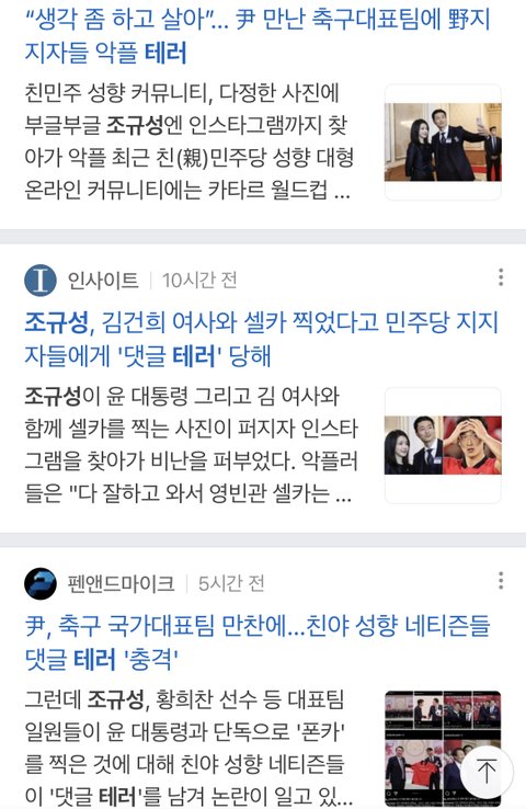 이것도 관심좀 가지자. 조규성 선수 대통령 부부랑 셀카 찍었다고 민주당지지층한테 인스타 테러받고 있음ㅋ 뭐 인스타에 지지한다는 게시물을 올린것도 아니고 걍 만찬때 사진 보고 저러는거임 ㅋㅋㅋ 심지어 국가대표 선수가 대통령 내외와 식사하고 사진찍는게 정치색을 유추할만할 일도 아님ㅋ 한국 대표해서 뛰고 왔으니 국민이 뽑은 대통령이 국민을 대신해서 축하하고 격려하는거지. 조규성 선수 보호해야함