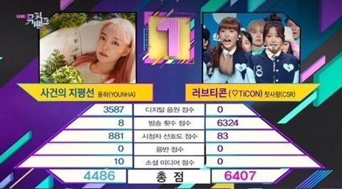 이해하기 어려운 이 순위에는 ‘방송점수’가 결정적인 역할을 한다. 첫사랑은 디지털 음원 점수, 음반 점수, 소셜 미디어 점수 0점이었지만 시청자 점수에서는 83점, 방송 횟수 점수에서는 무려 6324점을 기록해 총점 6407점으로 1위를 차지했다. 반면 윤하는 디지털 음원 점수 3587점, 음반 점수 0점, 소셜 미디어 점수 10점, 시청자 선호도 점수 881점, 방송 횟수 점수 8점을 기록했다. 총점 4486점이었다.