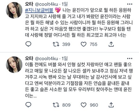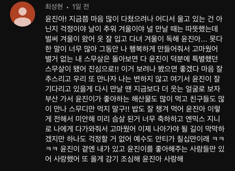 엔믹스 팬들이 지니한테 써 준 글 보면 지니가 평소에 팬들한테 얼마나 잘했는지 알 수 있는 듯 묵묵히 기다리고 밥 챙겨 먹고 잠 잘 자고 행복하라고 바래주는 거 보면 진짜.. 진정한 팬인 것 같음