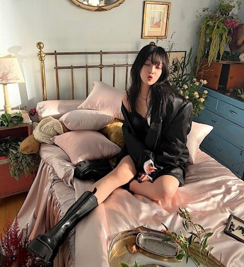 다른 사진에서는 침대에 앉아 사랑스러운 매력을 과시하고 있다. 여전히 아슬아슬하게 아우터를 걸친 채, chu 포즈를 취하고 있는 조이다. 쭉 뻗은 각선미 또한 눈길을 사로잡았다.