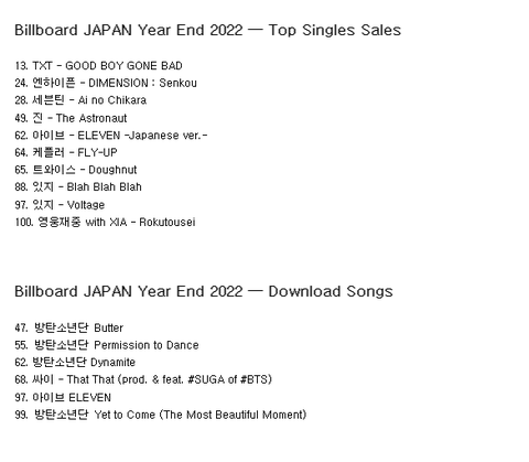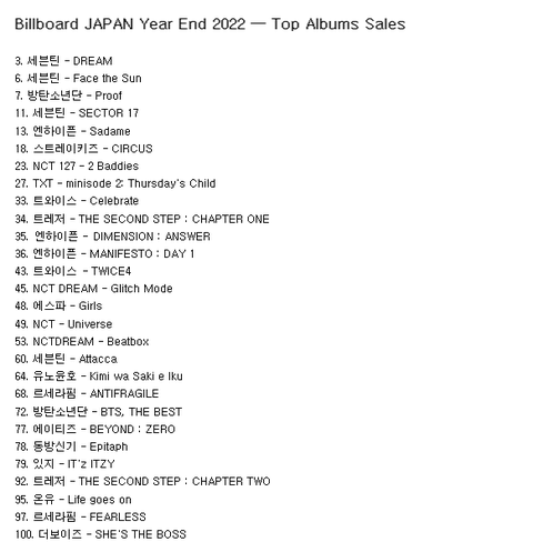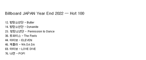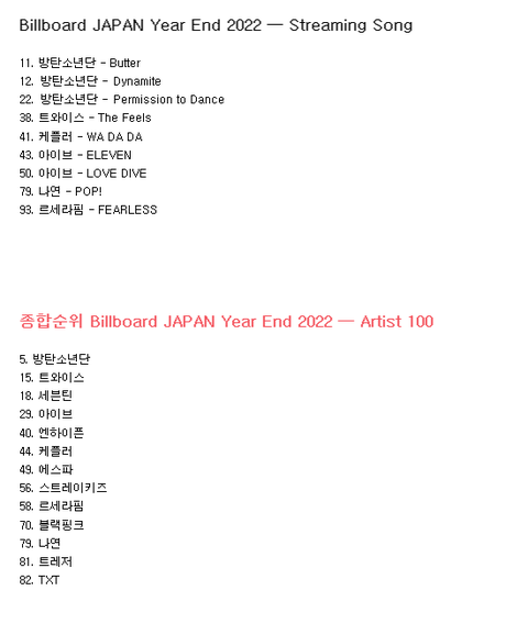 방탄소년단, 트와이스, 세븐틴, 아이브, 엔하이픈, 케플러, 에스파, 스트레이키즈, 스키즈, 르세라핌, 블랙핑크, 나연, 트레저, TXT, 투바투