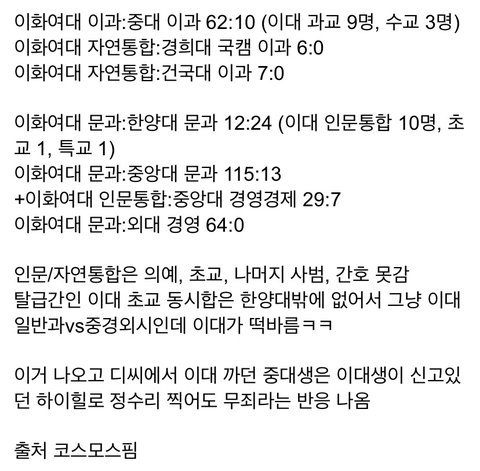 입시철되면 진짜 주기적으로 이대훌리들 몰려오네.. 그래도 이젠 너무 넘사인지 서성한은 못비비고 괜히 중대한테만 지랄함ㅠㅠㅋㅋㅋㅋ