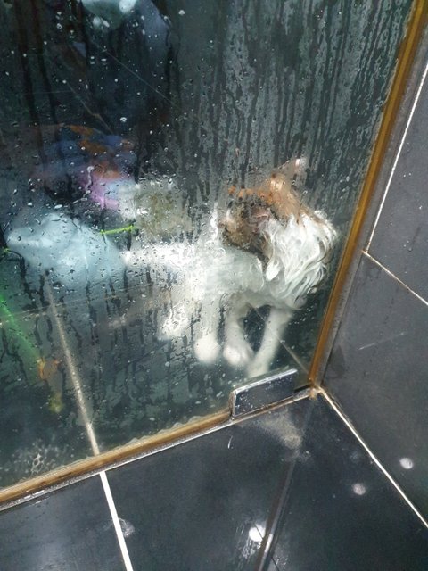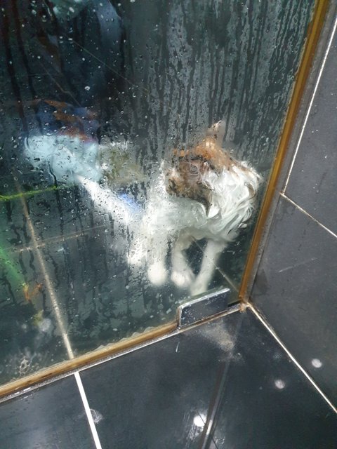 좁은공간이고 다리를 뻗으면 베리가 놀랄까봐 쪼그려 앉아 1시간 넘도록 있으니 다리를 저렸지만 알아들을까 싶은 이야기를 두런두런 해 주면서 마음은 감동이었습니다. 1시간이 그렇게 지나고 다시 10분 정도 흐른 후 드뎌 목욕을 시작했습니다.