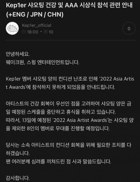 중국인 멤버와 소속사는 aaa 대상 불참을 미리 예고했다