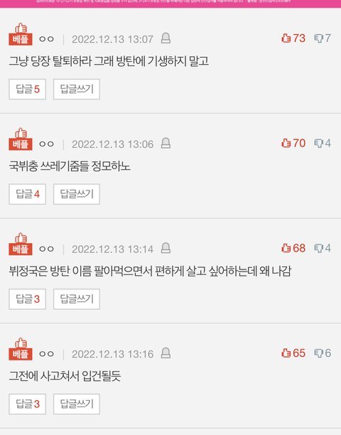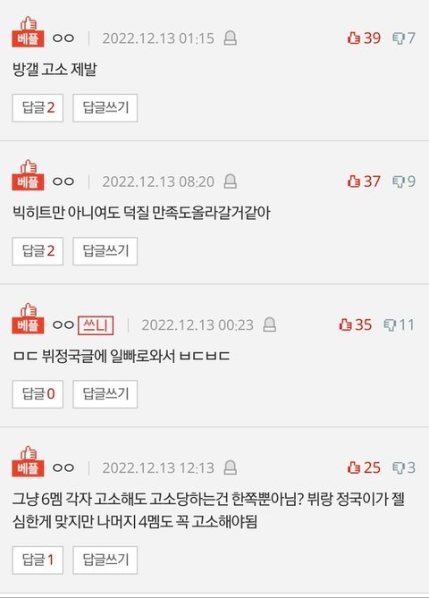 +이제봄 이글도 악개들이 베플조작했네 멍청하고 지겨워 ..추가함 뷔 정국 죽어라 까는 니네말이야 내 뻘글 뭐라고 톡선보내서 까질이냐고 나이먹고 아들뻘 열폭 작작해 빅히트 3자 고소 허용해