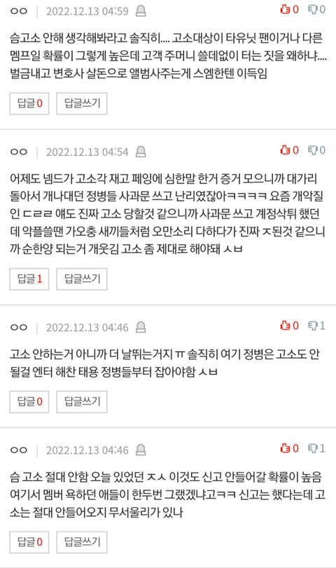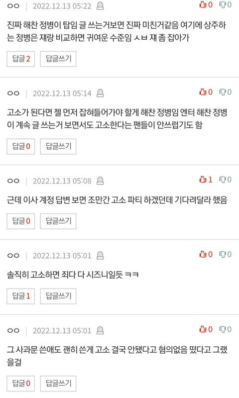 ㅈㄴ 소름임 지금 해찬이 글들도 갑자기 새벽 5시6시에 올라옴 아니 ㅈㄴ 티나는 짓을 왜하는거야? 고소먹인다니까 드디어 무서워서 정신이 나간건가? 아니 그리고 얼마나 현생이 없으면 평일에 이지랄이지? 개소름임 걍