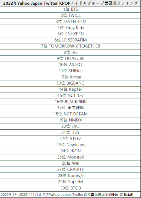 2022년 케이팝 아이돌그룹 일본 트위터 언급량 순위