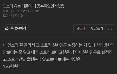 난 ㅅㅂ 첨에 뭔 소린지 도저히 이해가 안갔는데 알고보니까 지가 상대방을 친친에 넣은게 상대방도 알 수 있는지 그걸 말하는 거였음.. 가독성 ㅈㄴ 떨어진다니까 내가 인스타 안해서 이해 못하는 거라는데 니넨 바로 이해가 됨? 내가 국어를 못하는건가 ㅅㅂ
