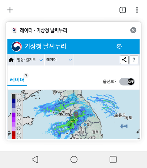 레이더 영상 강한 눈구름대 계속 서울 수도권 중부지방으로 진입중