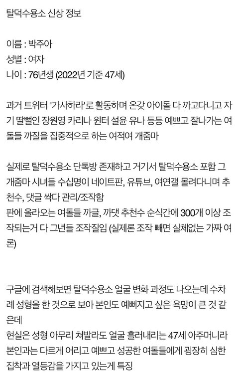 카리나랑 장원영이 누가봐도 얼굴 ㅈㄴ 작고 개이쁘고 잘나가는 4세대 1군 대상그룹 갓생여돌들이라 조작충 여적여 개줌련 붙어서 그래 ㅠㅠ 근데 걍 냅둬 불쌍해 쟤도.. 얼마나 현실에서도 판에서 나대는것처럼 카리나 장원영 까고싶겠어ㅜㅠㅠ 근데 현실에선 지 주변 남자들도 다 카리나 장원영같은 여자만 좋아하고 지같은 쓸모없는년은 아무도 사랑해주지 않으니까 이쁘고 잘난 여돌들 보고 판에서라도 저렇게 푸는거임... 여기서라도 열심히 정신승리 하라그래~~ 현실은 둘다 대상가수에 돈 ㅈㄴ 잘버는 1군 갓생들 ^^