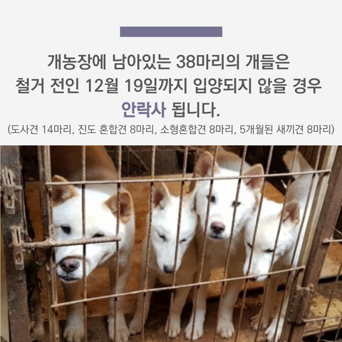 추운 실외에서 하루하루 안락사날을 앞두고 버텨가고 있는 38마리의 개들이 기회를 가질 수 있도록 도와주세요.