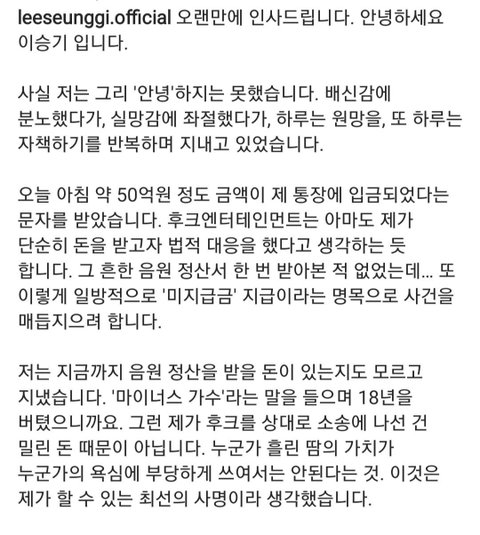 난 이거 보고 이승기 진짜 똑똑하다 싶었음. 물론 좋은 의미로. 후크에서 그래도 빠르게 나름 큰 돈을 일시에 정산했고(근데 실제로는 훨씬 못미치겠지) 이승기가 여기에 대해 이게 다가 아니다 뭐 이런 걸 예상했을 거고 그럼 이승기를 진짜 돈에 눈먼 이미지로 어느 정도는 몰아갈 수 있었을텐데 받자마자 그냥 다 기부하겠다. 후크 완전 바보로 만들어버림. 장하다 이승기