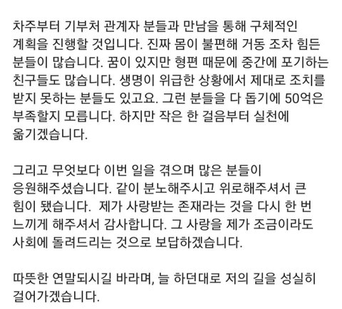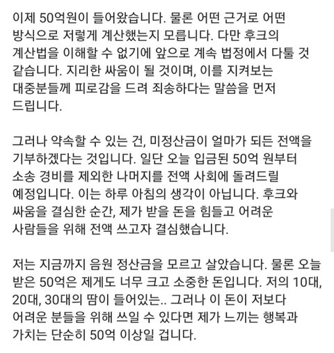 아무리 성공한 연예인이라도 50억이면 진짜 큰돈일텐데 도대체 그동안 얼마나 속이 상하고 마음 고생을 했으면 그 돈 내가 안갖고 기부하겠다라고 한걸까. 소속사 문제 공개적으로 드러낸게 진짜 돈 때문이 아니라 마음이 너무 힘들었다는 거잖아. 그 와중에 50억도 제대로 정산한 건 아닐 것 같고.