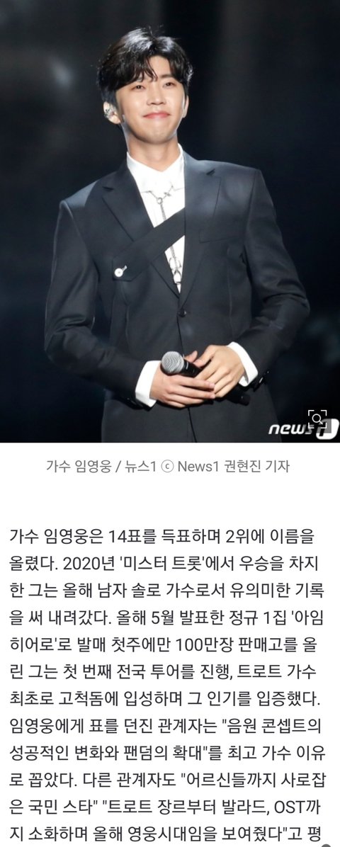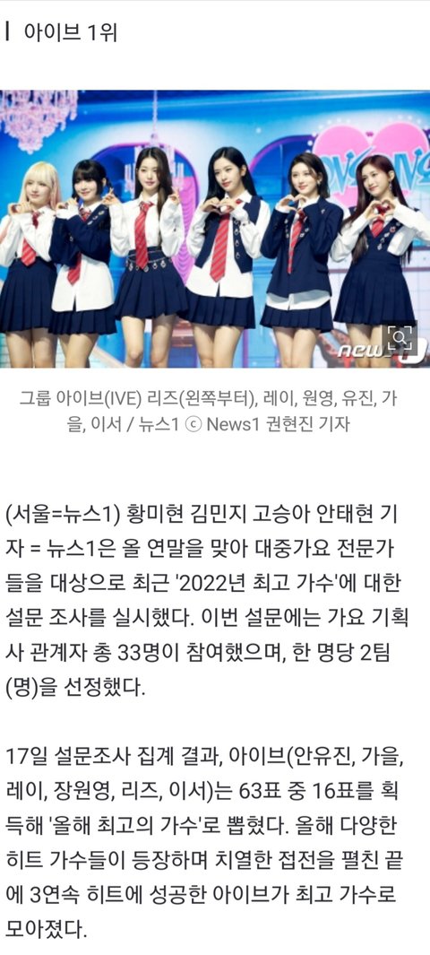 뉴스1은 올 연말을 맞아 대중가요 전문가들을 대상으로 최근 '2022년 최고 가수'에 대한 설문 조사를 실시했다. 이번 설문에는 가요 기획사 관계자 총 33명이 참여했으며, 한 명당 2팀(명)을 선정했다.
