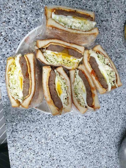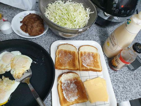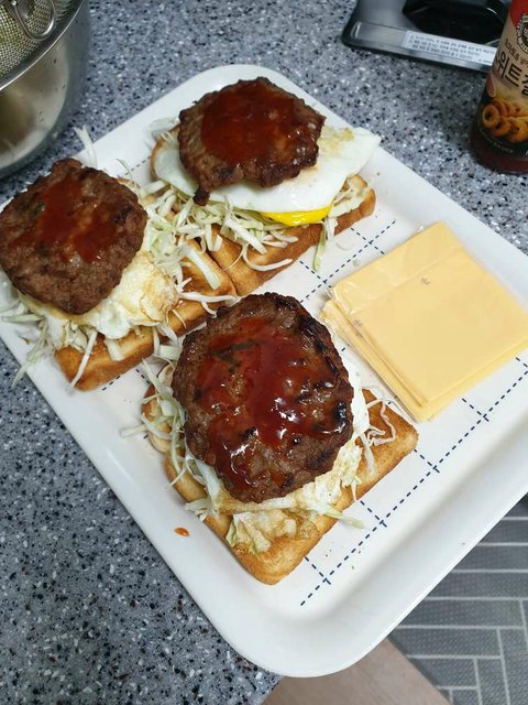 식빵 토스트기에 구워서 한면에 마요네즈 바르고 양배추 떡갈비 계란 치즈 얹고 집에 있는 소스 돈까스소스 써도 되고 있는 소스 아무거나 쓰세요.