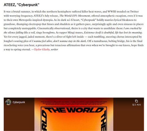 북반구가 살인적인 폭염을 겪은 잔인한 여름이었고, 세계 3차 대전은 걱정스러운 빈도로 트위터에서 유행했다. 에이티즈의 7월 발매작인 월드 EP1: 무브먼트는 비록 그들 자신의 메트로폴리스에서 영감을 받은 디스토피아일지라도 분위기 탈출을 제공했다. 어두운 공상과학 영화의 심장인 "사이버펑크"는 서정적인 황량함과 웅장함을 대담하게 결합시키고, 속도를 낼 때마다 쉿쉿 소리를 내고, 심지어는 군데군데 구불구불하지만, 전혀 멈출 수 없는 전기 팝을 쿵쿵 울린다. 영화적으로 관찰할 수 있는 그들의 도시는 그들을 섬멸하기를 원하는 도시이다. 나는 베일처럼 떨어지는 침묵에 짓눌린다"고 성화가 노래한다. 래퍼 민기가 생각하듯이 존재 자체가 의심스럽다는 것은 삶의 의미를 잃어버린 것이다. 그러나 들쭉날쭉하고 지칠 대로 지친 순간마다 내부에는 약간의 싸움이 남아있다. - 각각의 텀블링하고 비웃는 합창이 종호의 치솟는 "살아있는 것을 느끼고 싶다, 어둠 속에 있고 싶지 않다"는 호소에 의해 가로막혔다. 떠들썩하고 벨트를 매는 다리에서, 그의 목소리는 여러분이 들을 수 있는 마지막 리코칭 목소리이며, 우리가 무릎을 꿇었을 때에도, 희망은 영원한 봄을 찾는다는 불안정하지만 끈질긴 확언이다. —테일러 글래스비, 작가