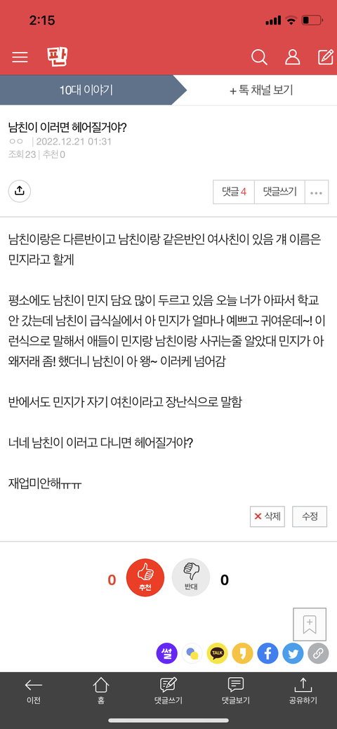 남친이랑 좀 싸웠는데 남친이 크리스마스 같이 보낼 사람 이케 올림 얘가 잘못해서 좀 티격태격 함 ㅋㅋㅋ _같은데 ㅅㅂ 헤어지자고 해도 되나